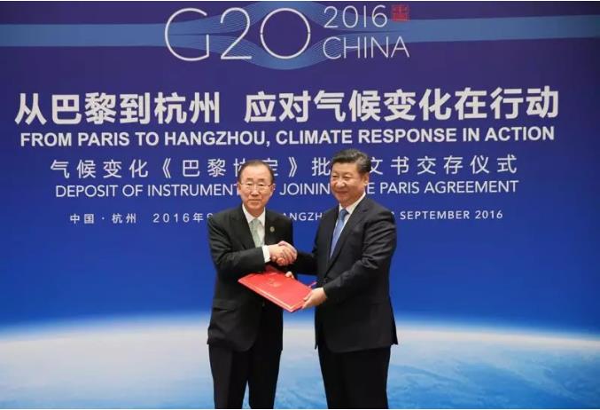 △2016年,習(xí)近平向潘基文交存中國氣候變化《巴黎協(xié)定》批準(zhǔn)文書。